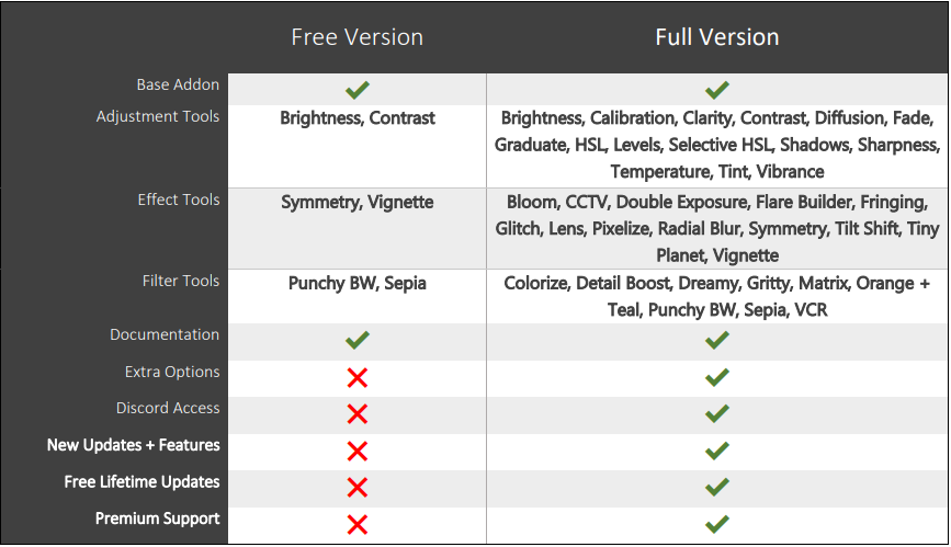 Gain access to features such as: Color Calibration, Vibrance, Levels, Lens Flares and much more!