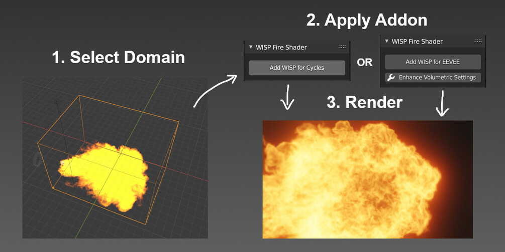 WISP is a shader for the Cycles Render Engine that takes your existing fire simulation and applies corrected shading to the volume, turning what used to be a bright gloopy mess, into a magnificent rolling fireball. It provides better depth perception, visual fidelity and animatable burn control with no extra simulation cost!